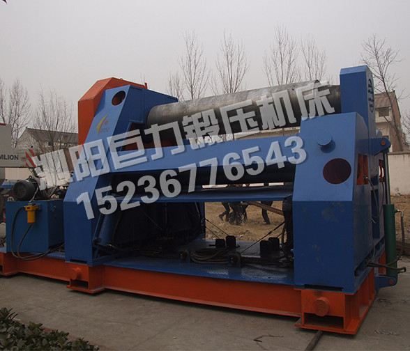該四輥卷板機(jī)與對(duì)稱(chēng)三輥卷板機(jī)比較,它可以不借助其它設(shè)備模具,直接予彎板材端部,而且剩余直邊較??;它可以不使板材調(diào)頭,而卷成工件。