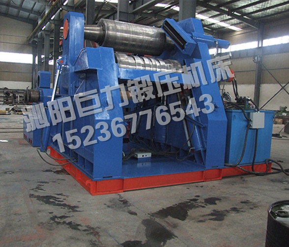 該四輥卷板機與對稱三輥卷板機比較,它可以不借助其它設備模具,直接予彎板材端部,而且剩余直邊較小;它可以不使板材調頭,而卷成工件。